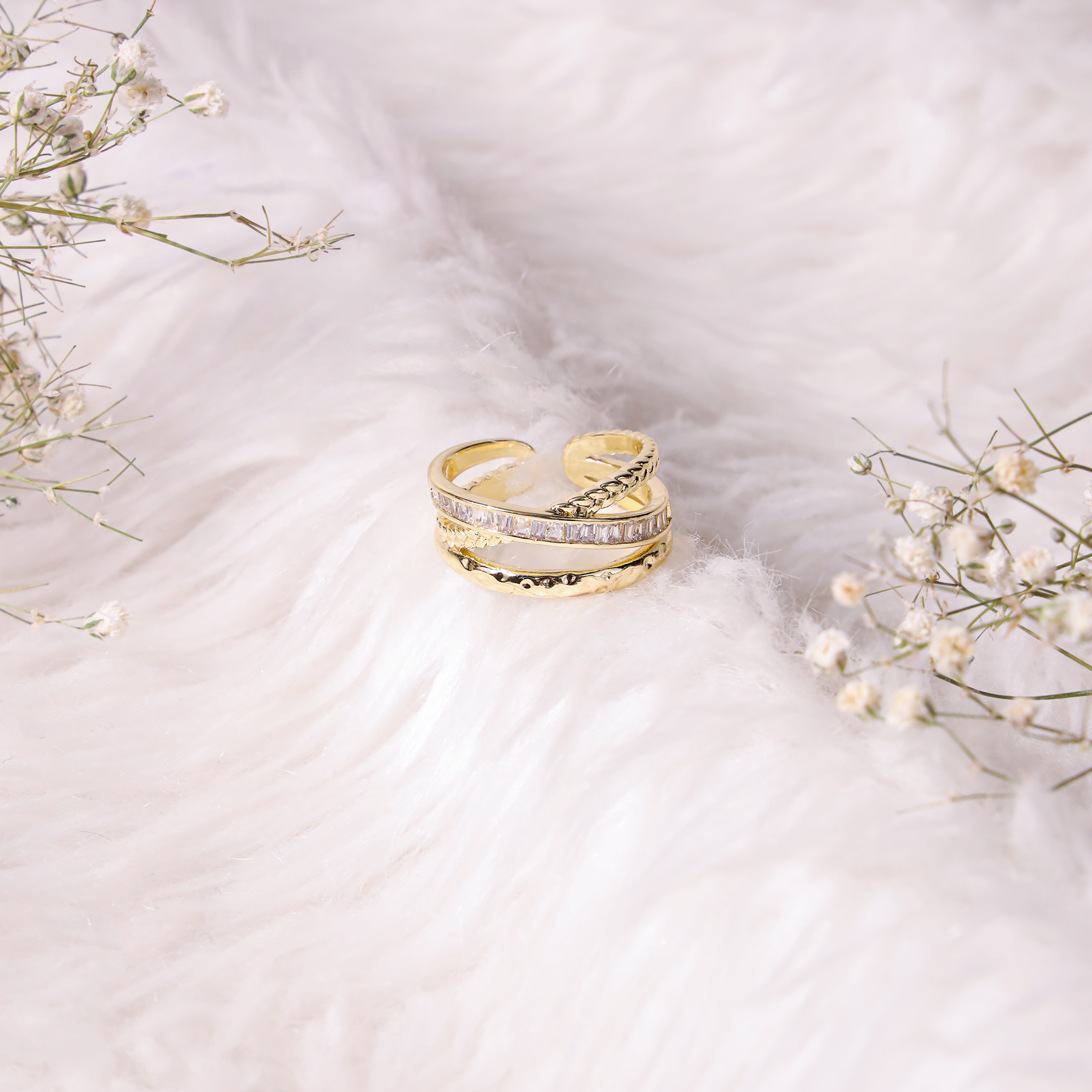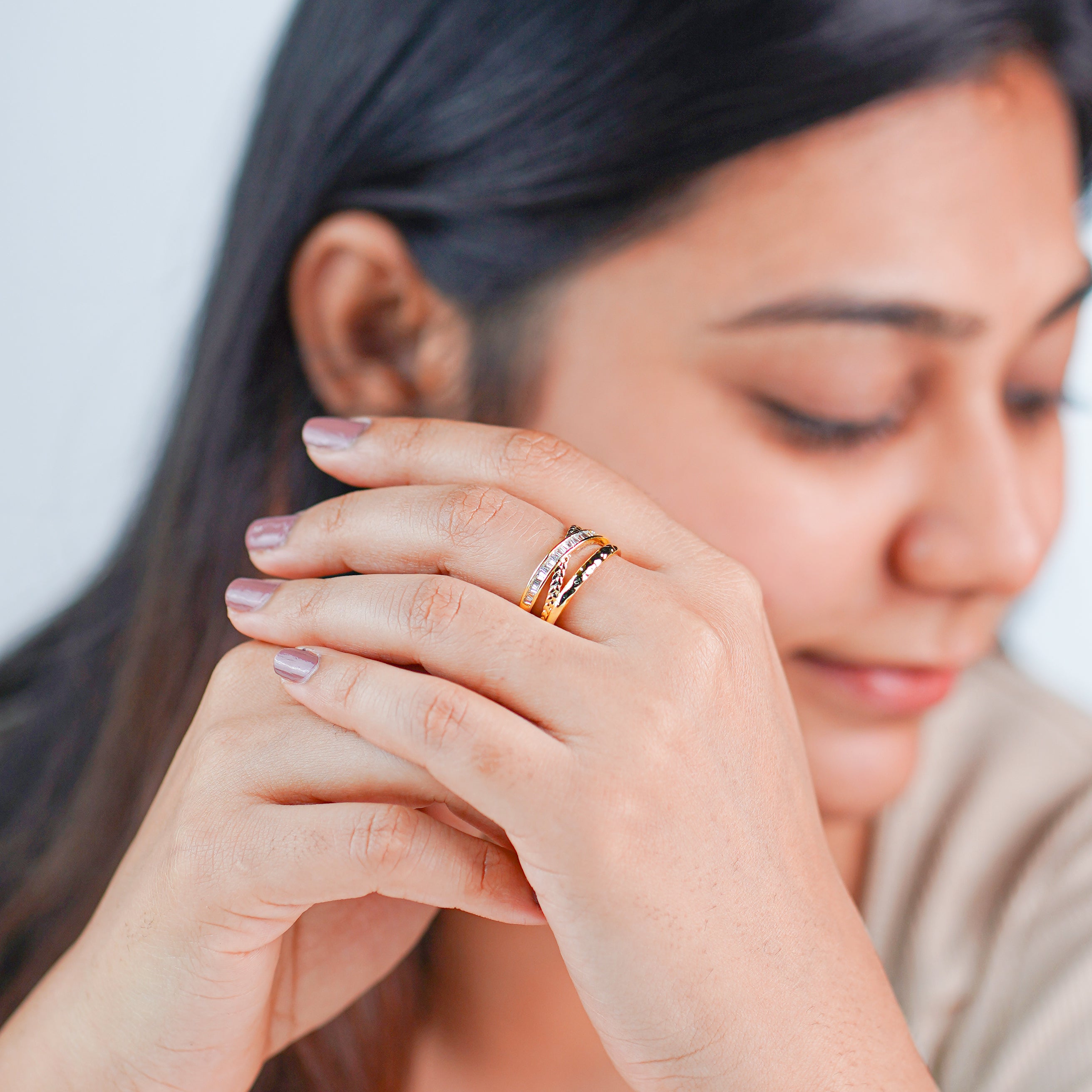 The Criss Cross Diamond Studded Adjustable Ring features a chic, interwined design adorned with sparkling diamonds. Its adjustable band ensures a perfect fit, adding elegance and sophistication to any look.