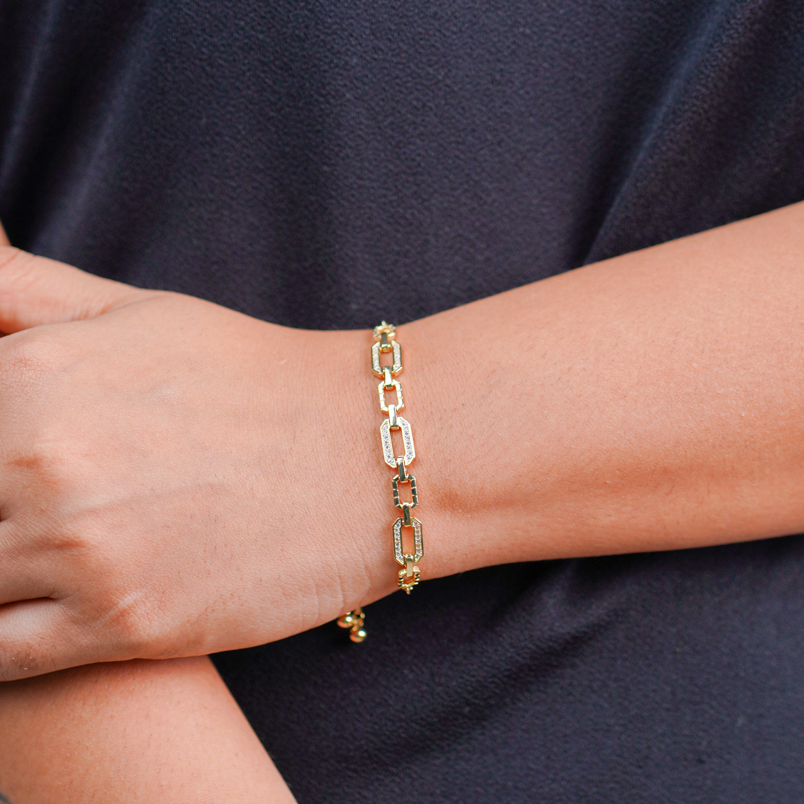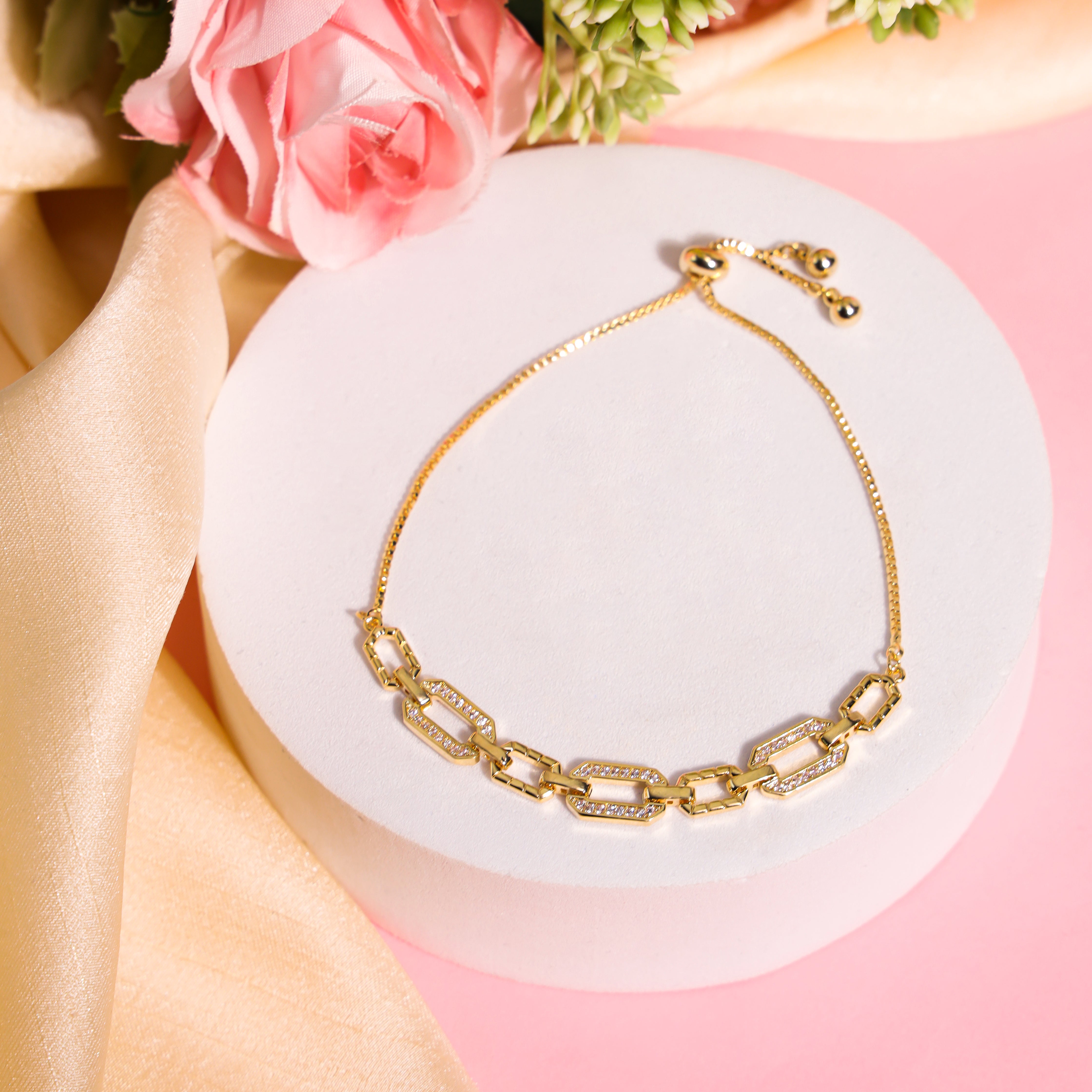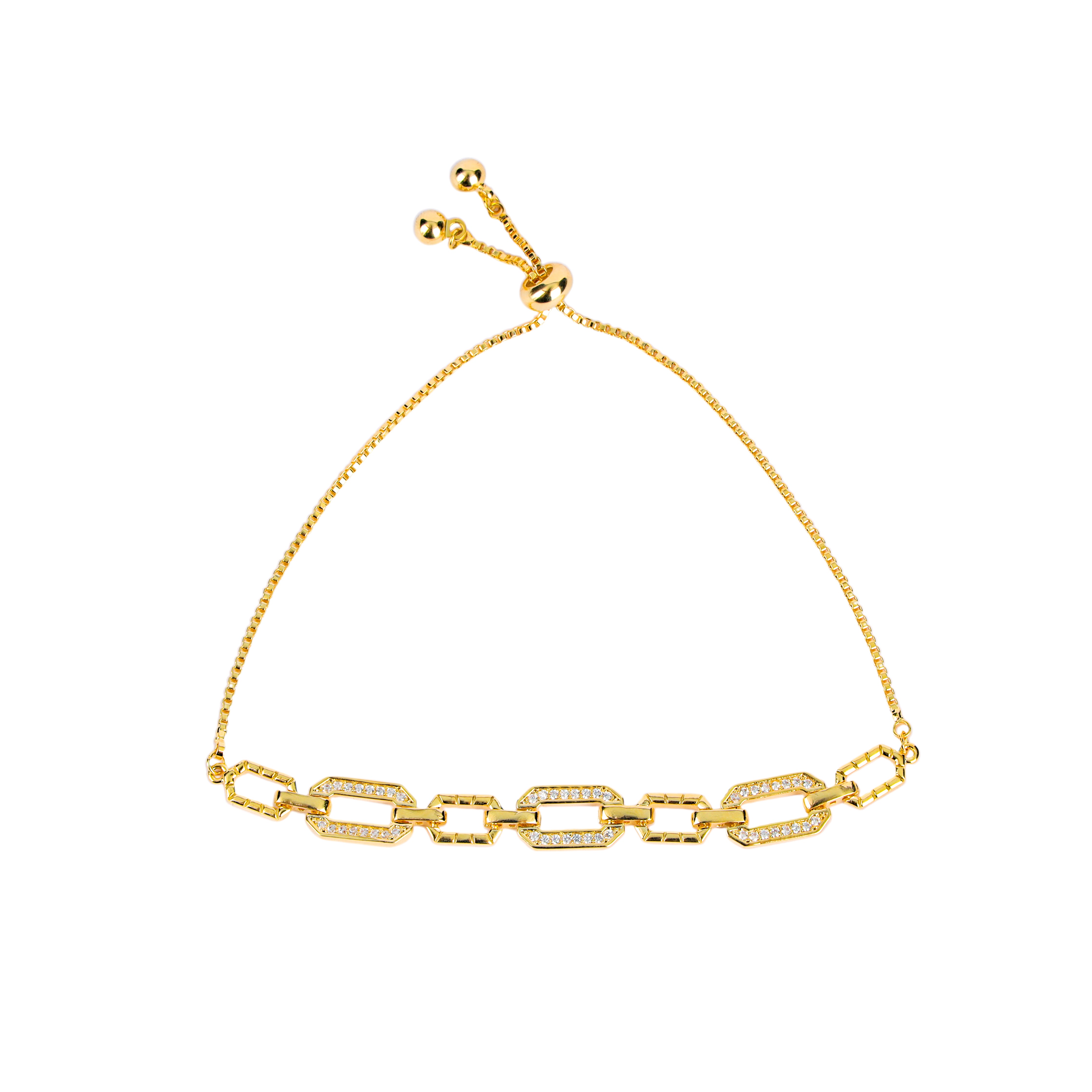 The Cubic Adjustable Bracelet features a sleek design with sparkling cubic zirconia design, offering a touch of elegance and shine. Its adjustable band ensures a comfortable fit for all wrist sizes.
