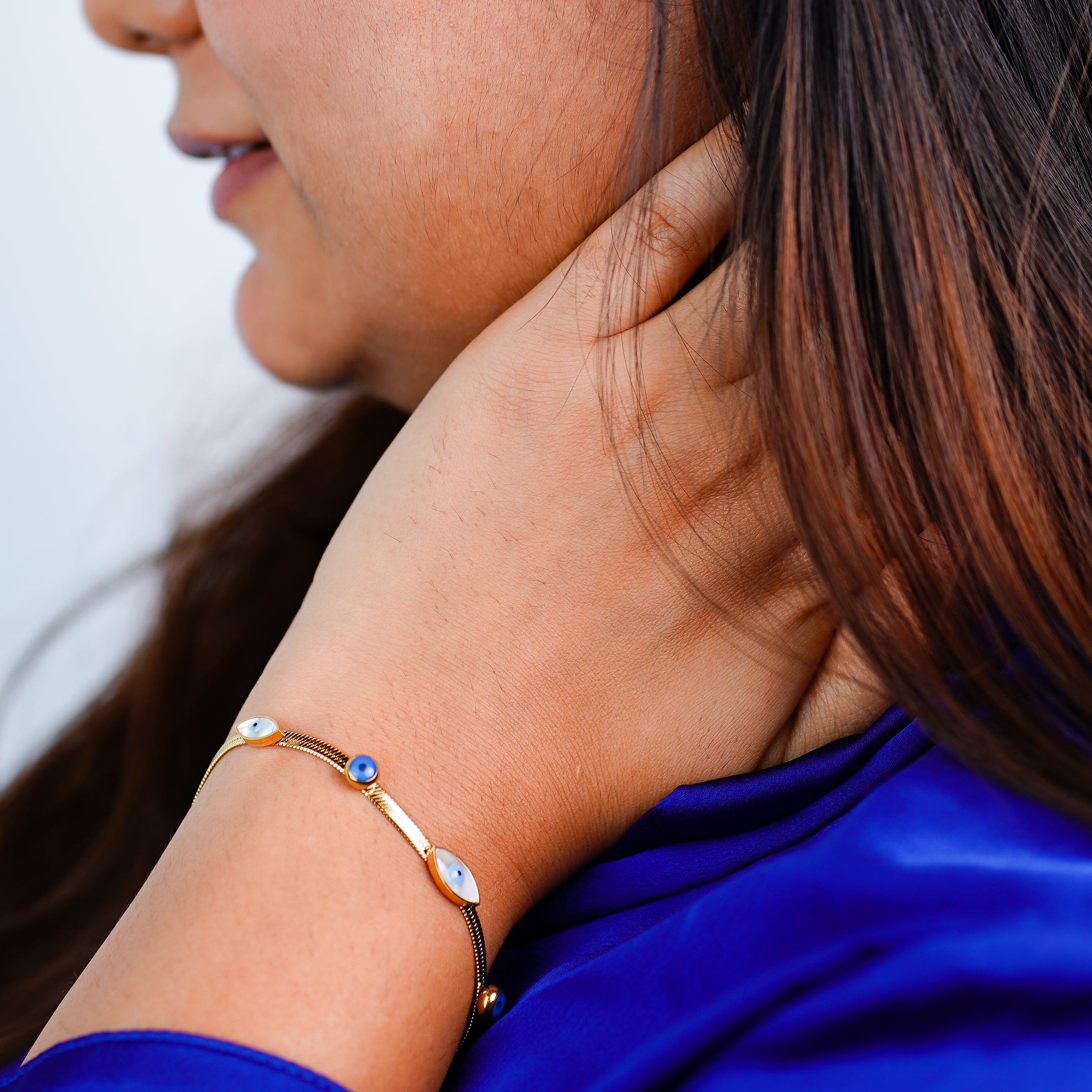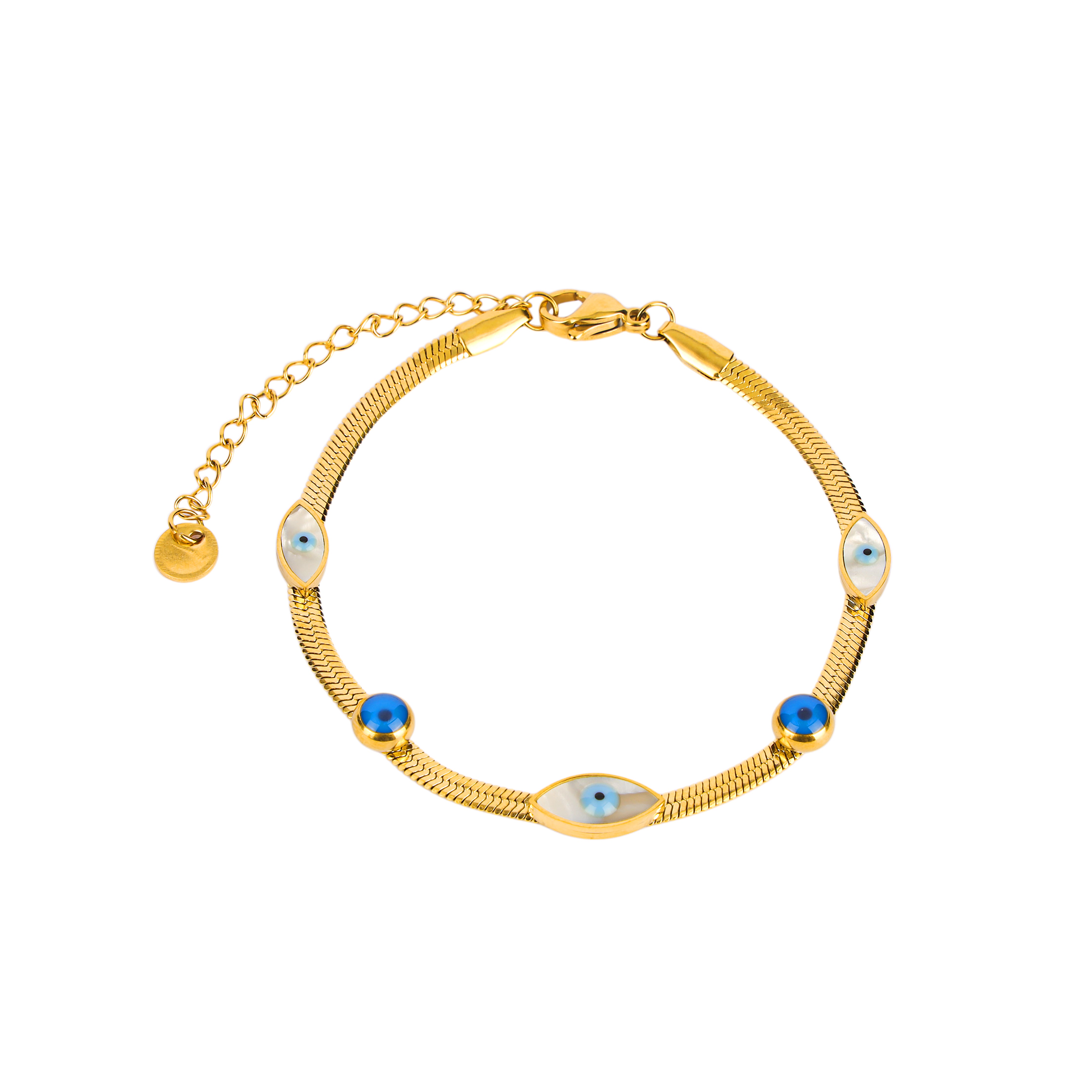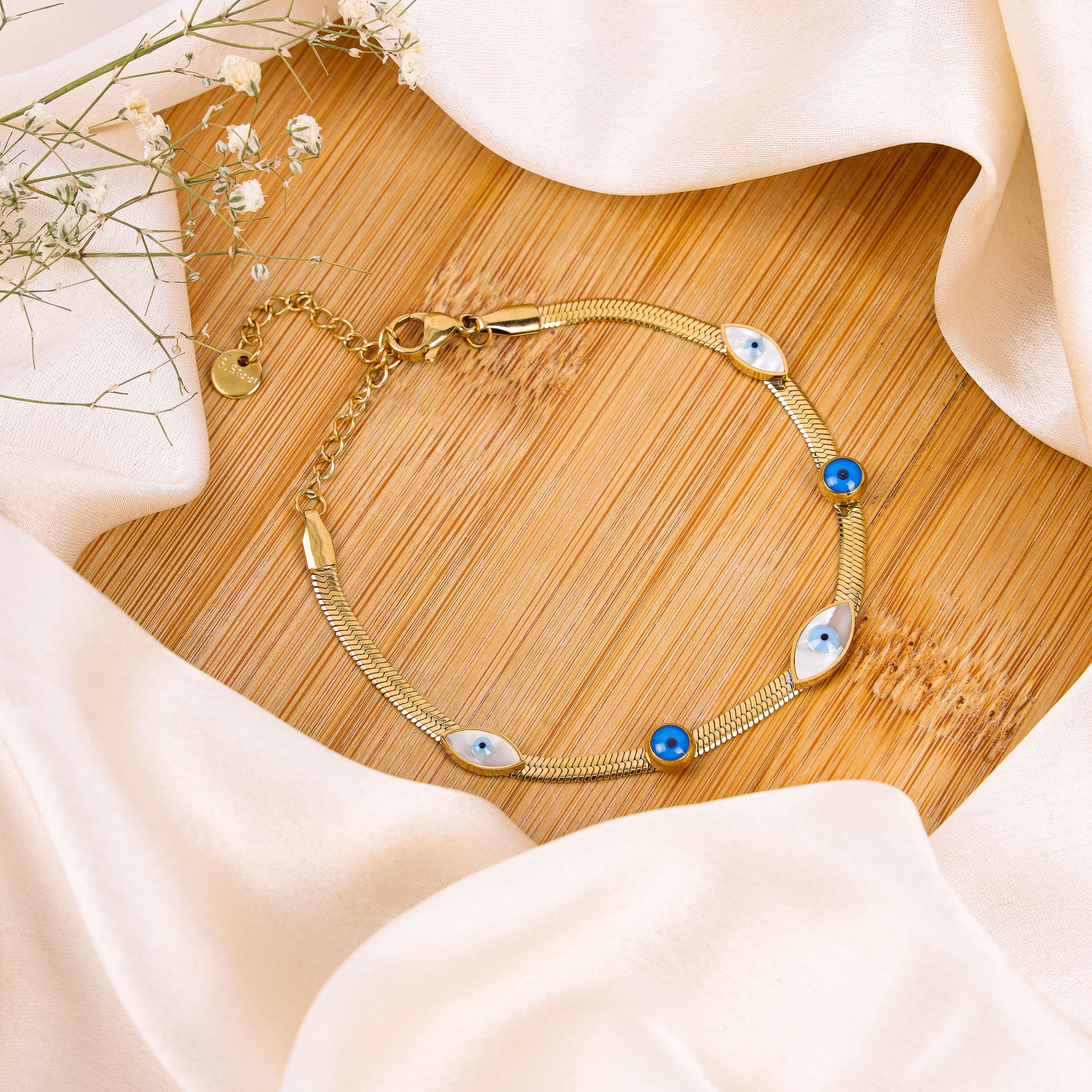 The Evil Eye Snake Chain Bracelet combines a sleek snake chain with a protective evil eye charm. This stylish piece offers both contemporary elegance and spiritual protection.
