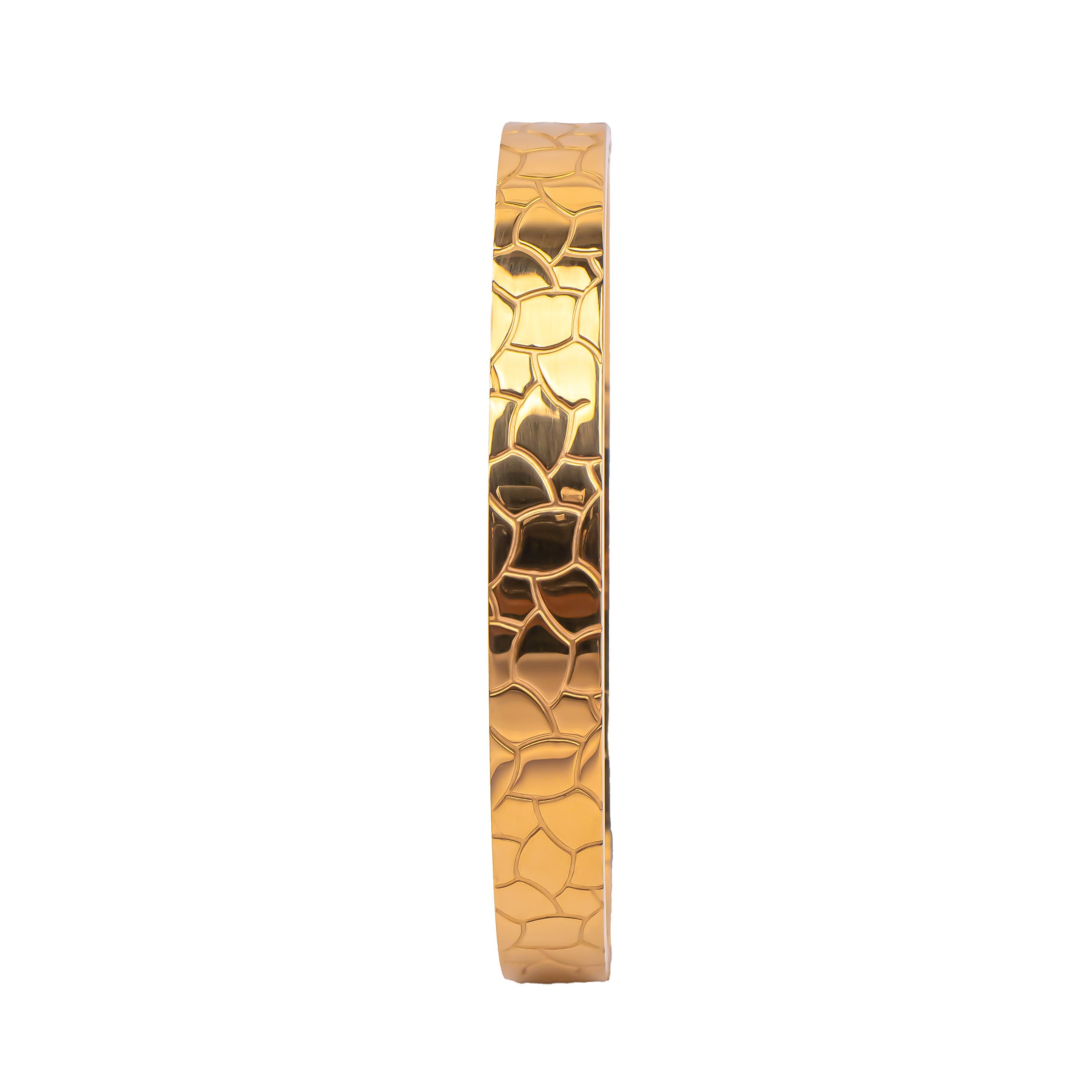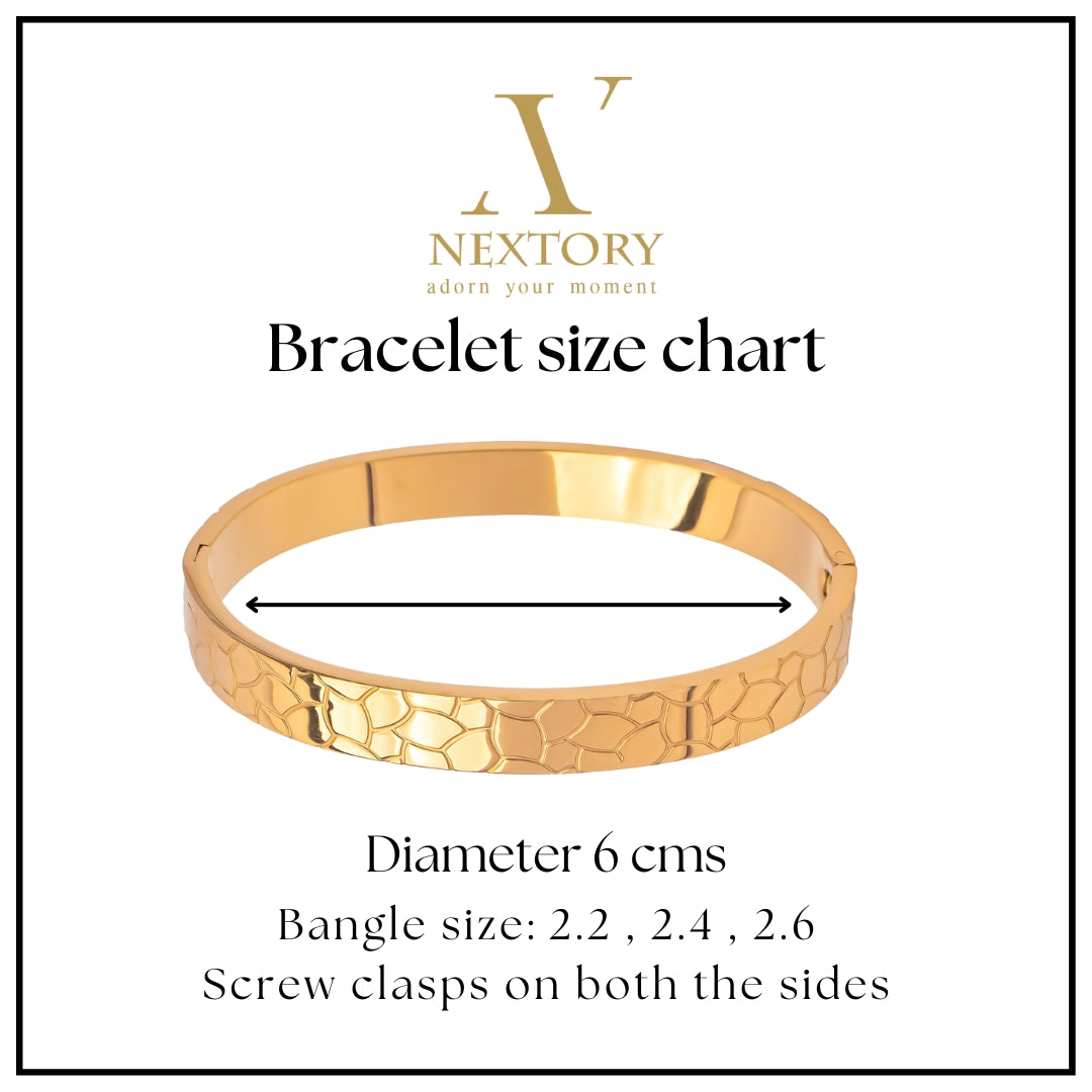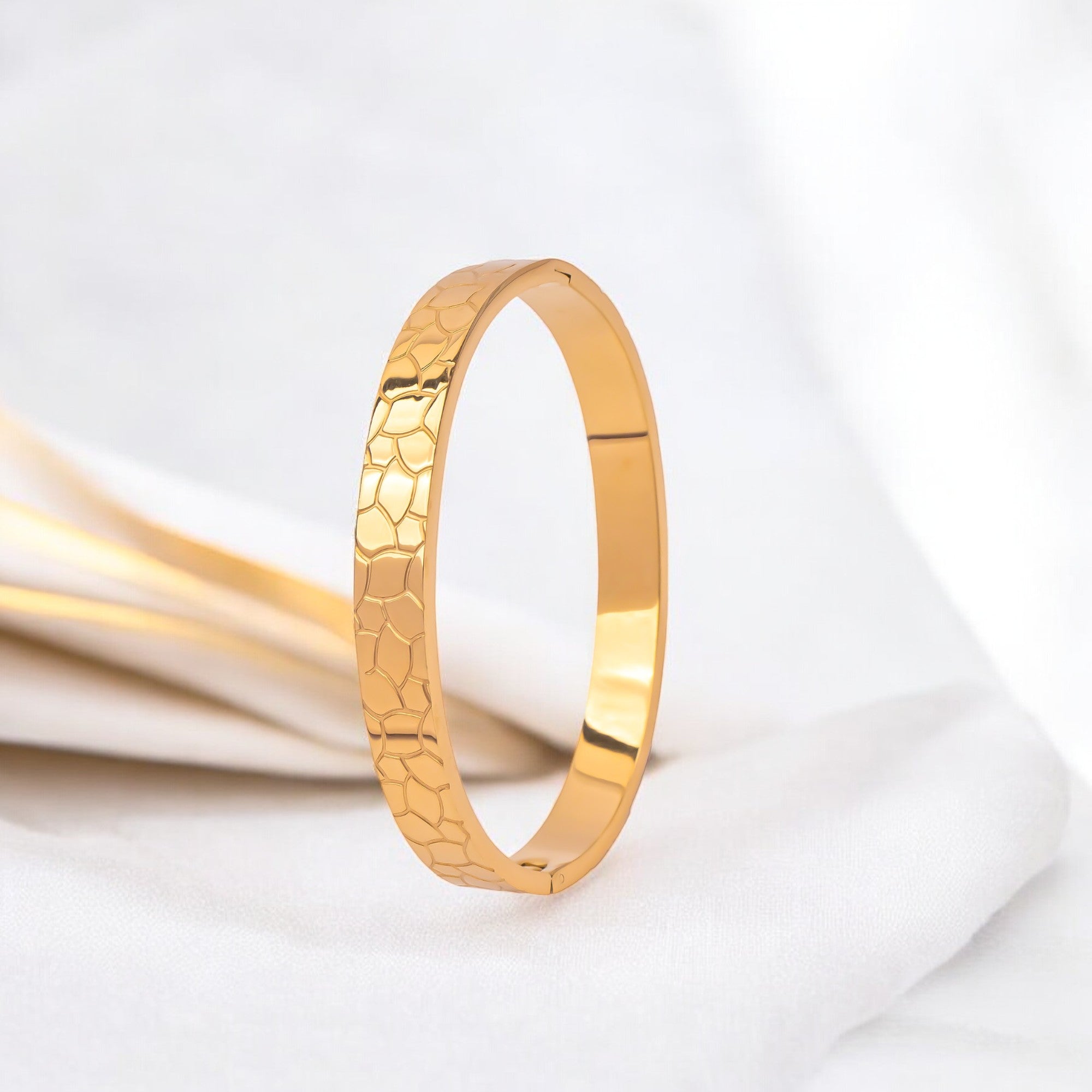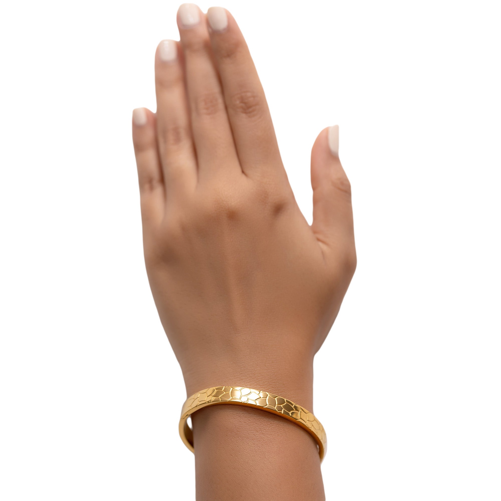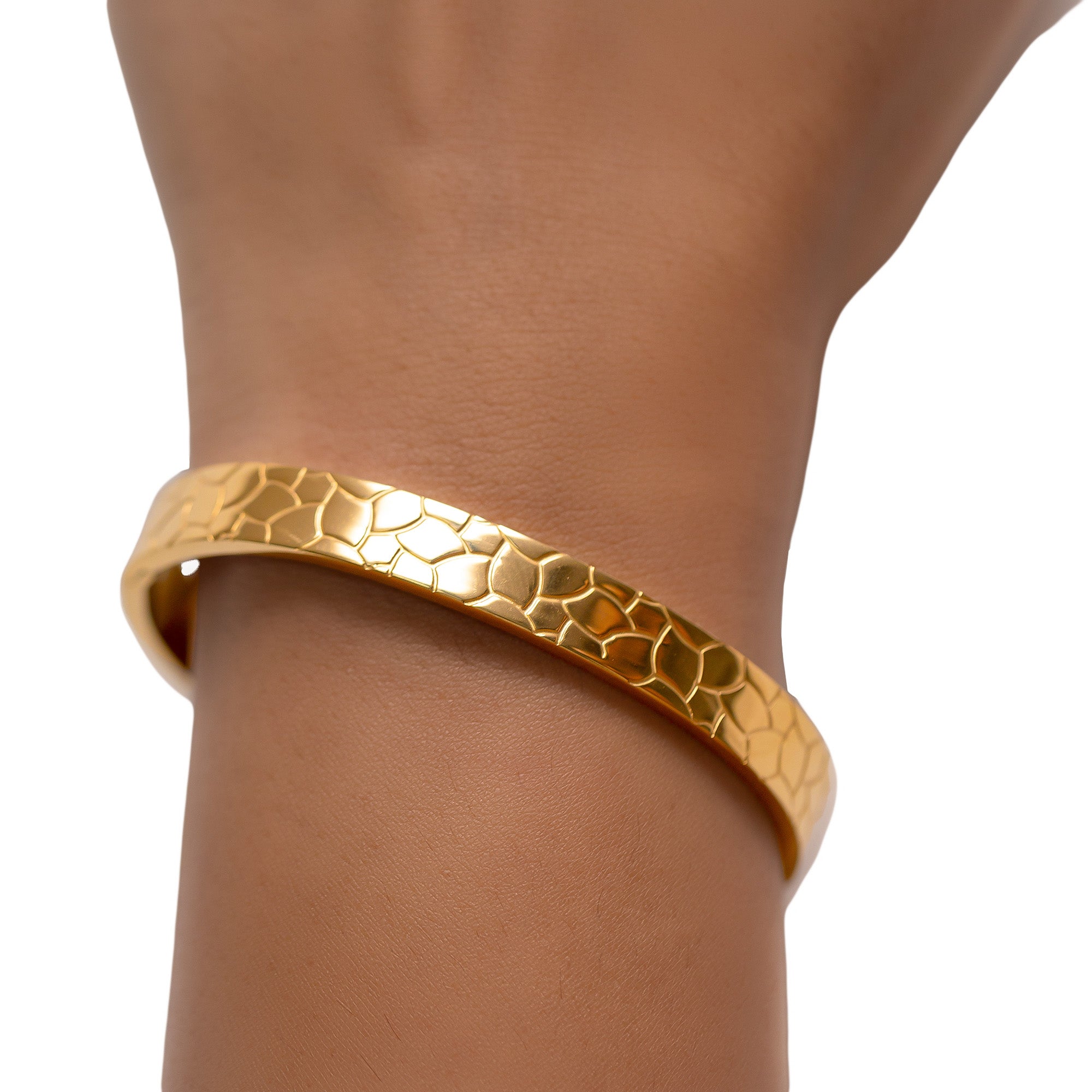 The geo textured bracelet features a modern design with geometric details that create a striking visual appeal. Its unique texture adds depth and sophistication, making it a versatile accessory for any outfit.