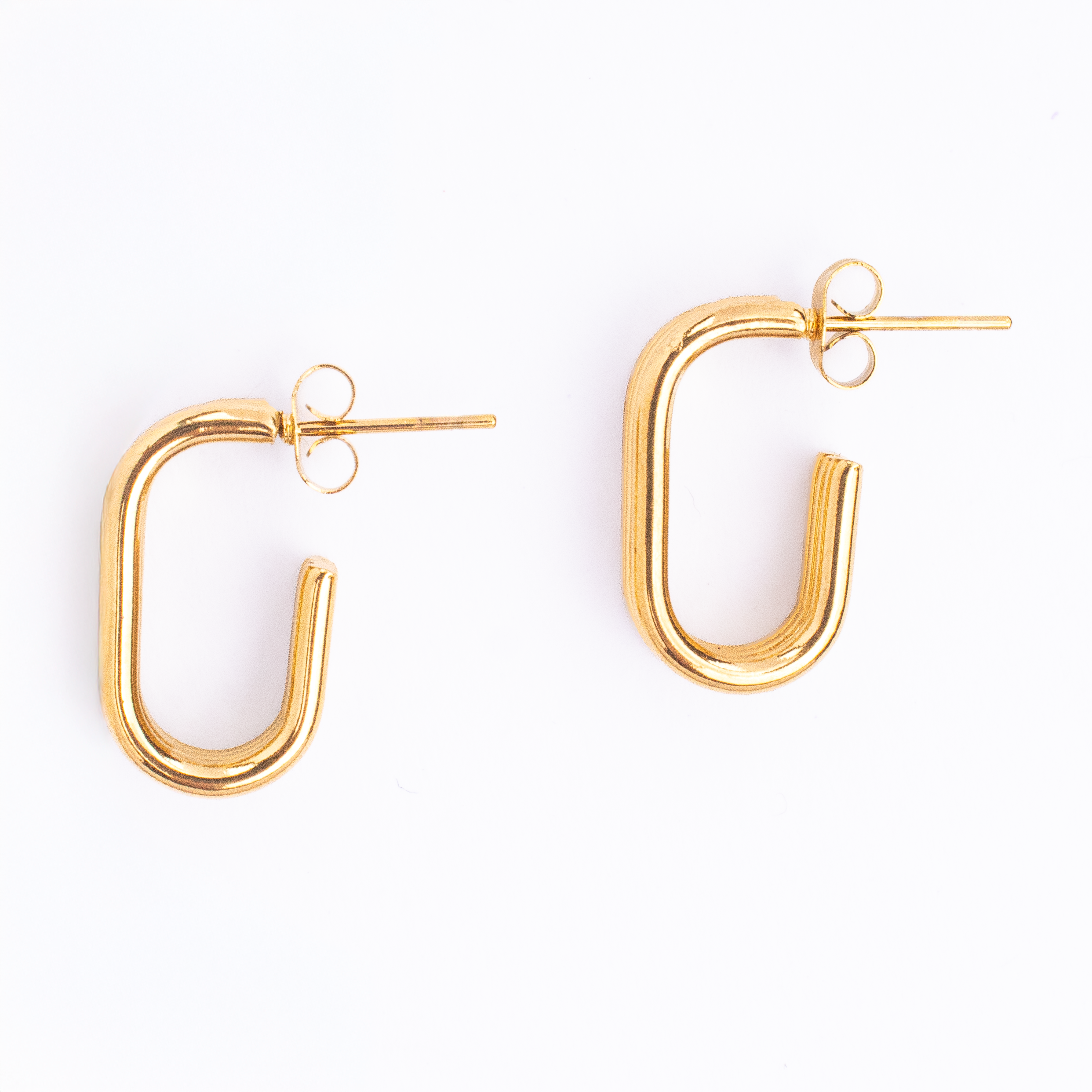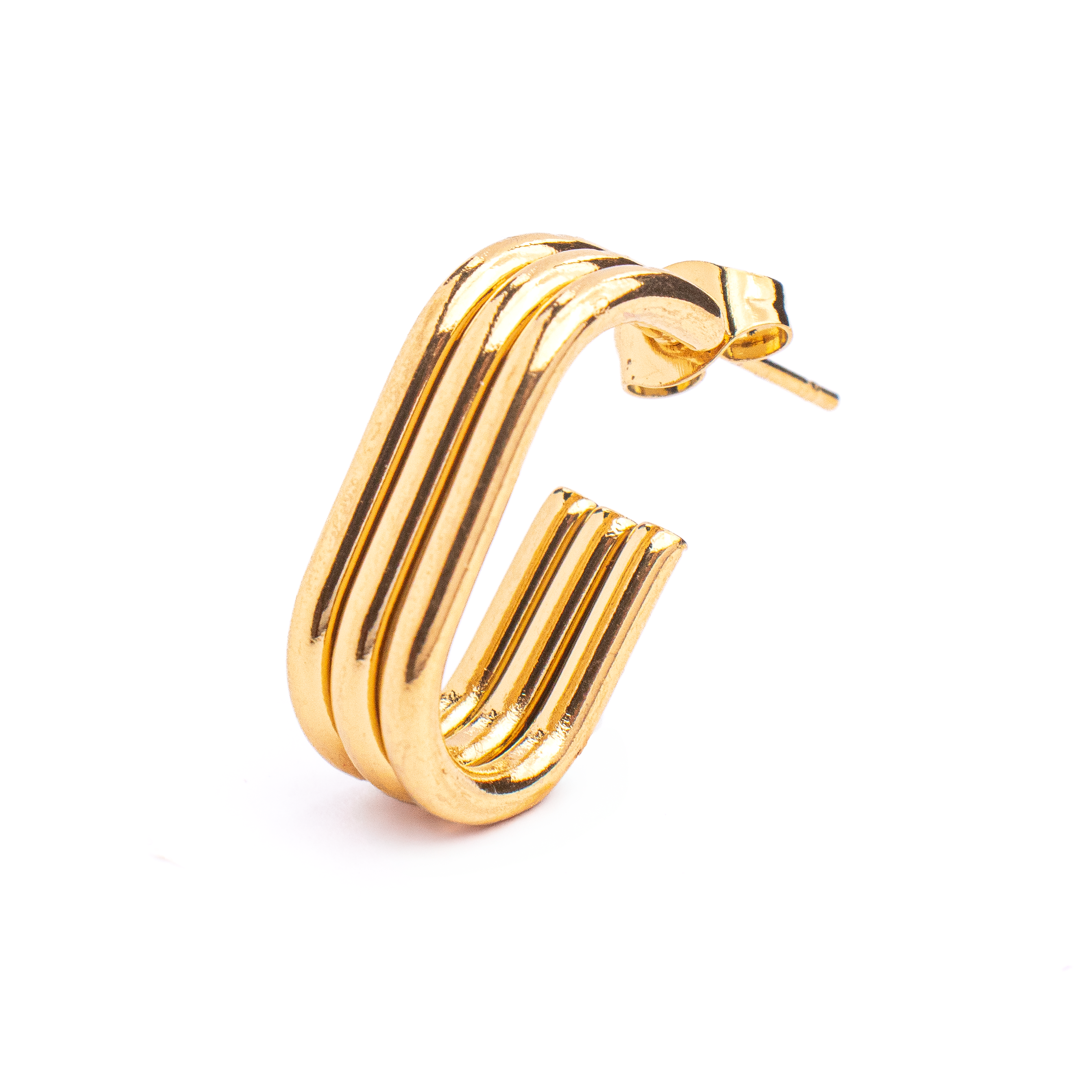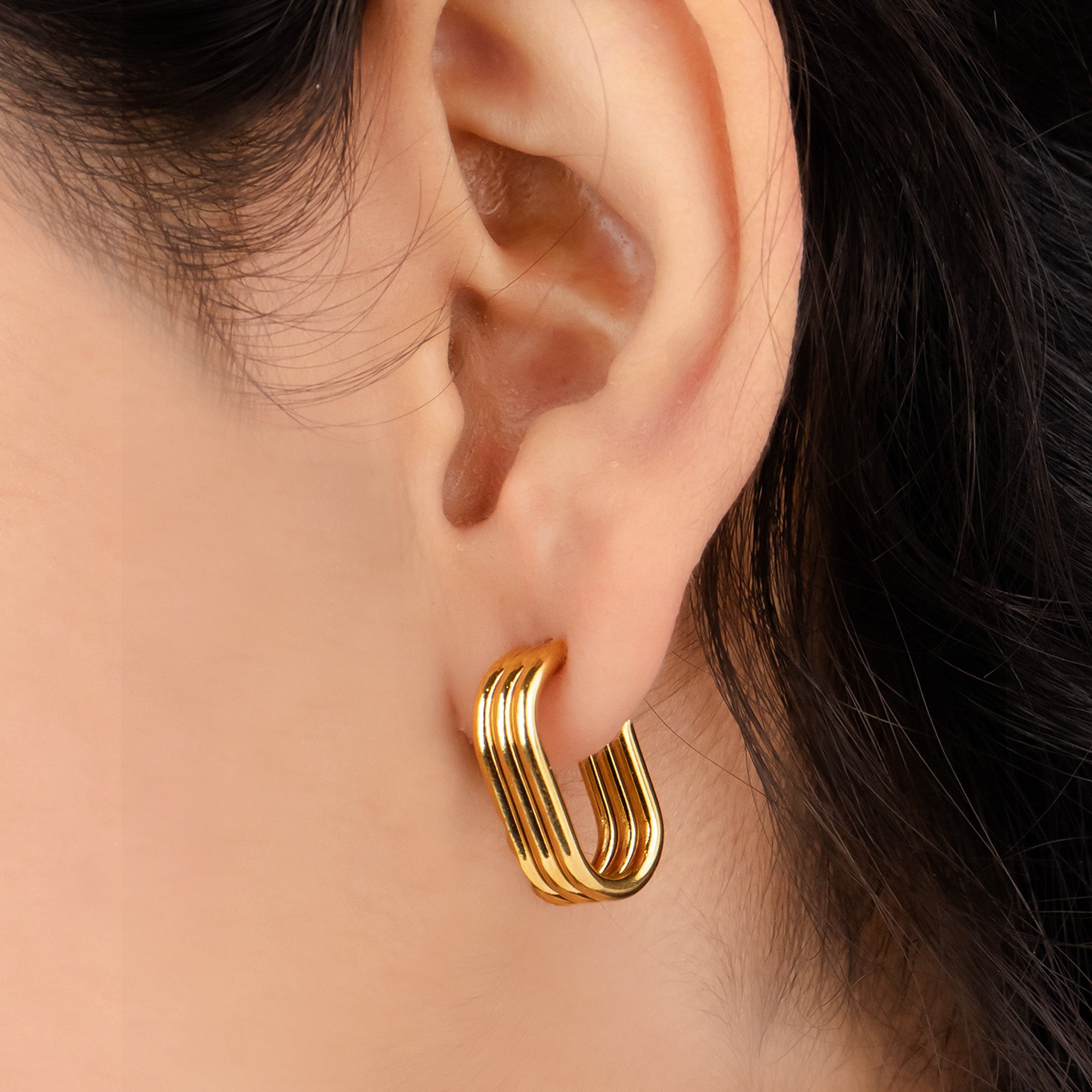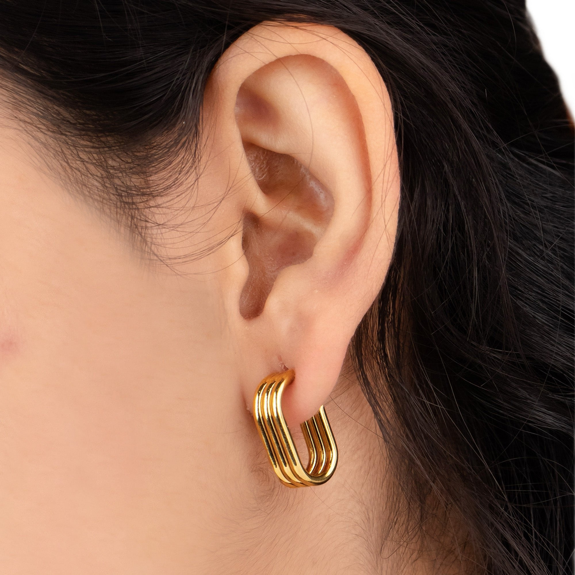 Bring sleek sophistication to your style with these three-lined oval half hoops, featuring intersecting lines and curved silhouettes that evoke modern elegance.These refined earrings add a touch of understated luxury and subtle glamour to any outfit