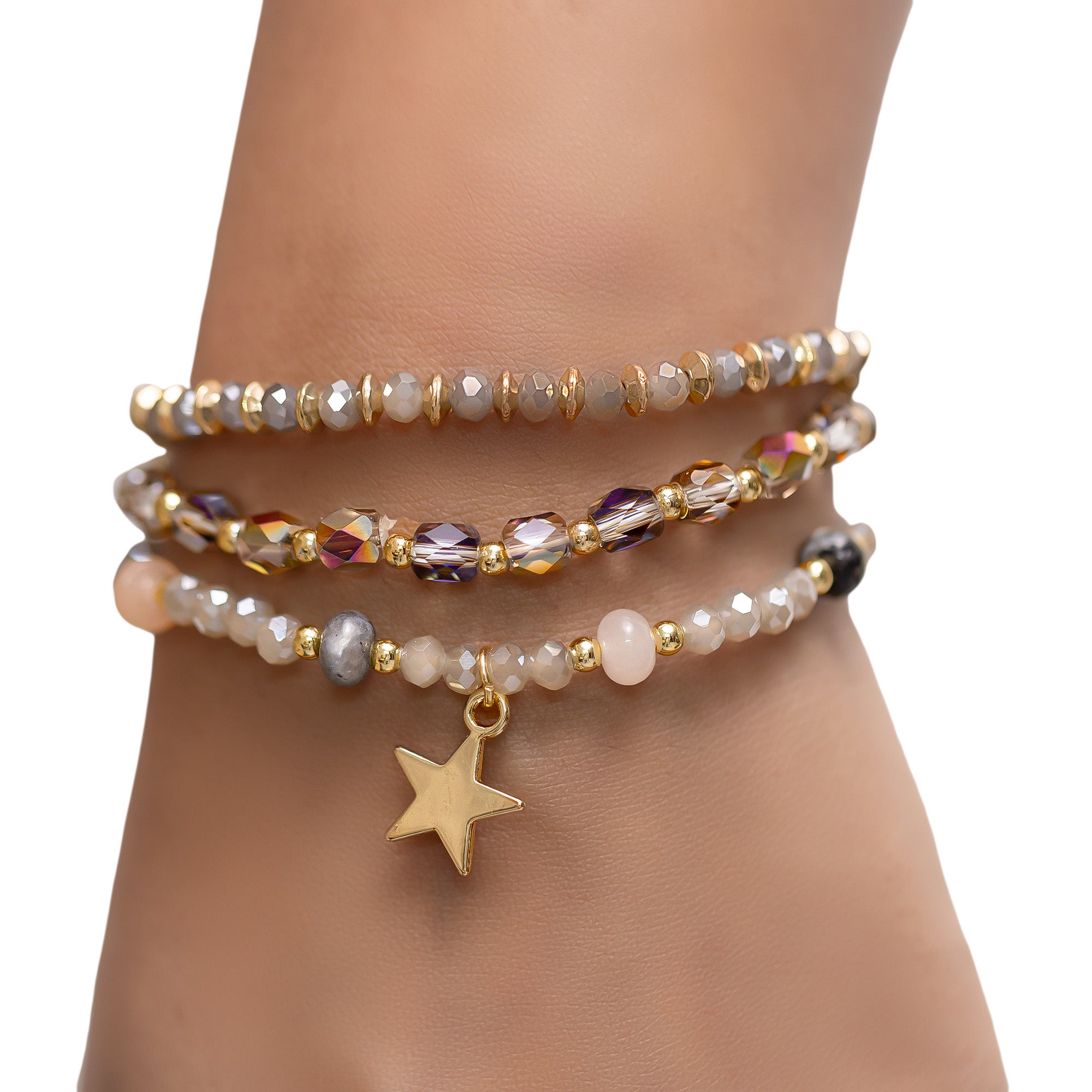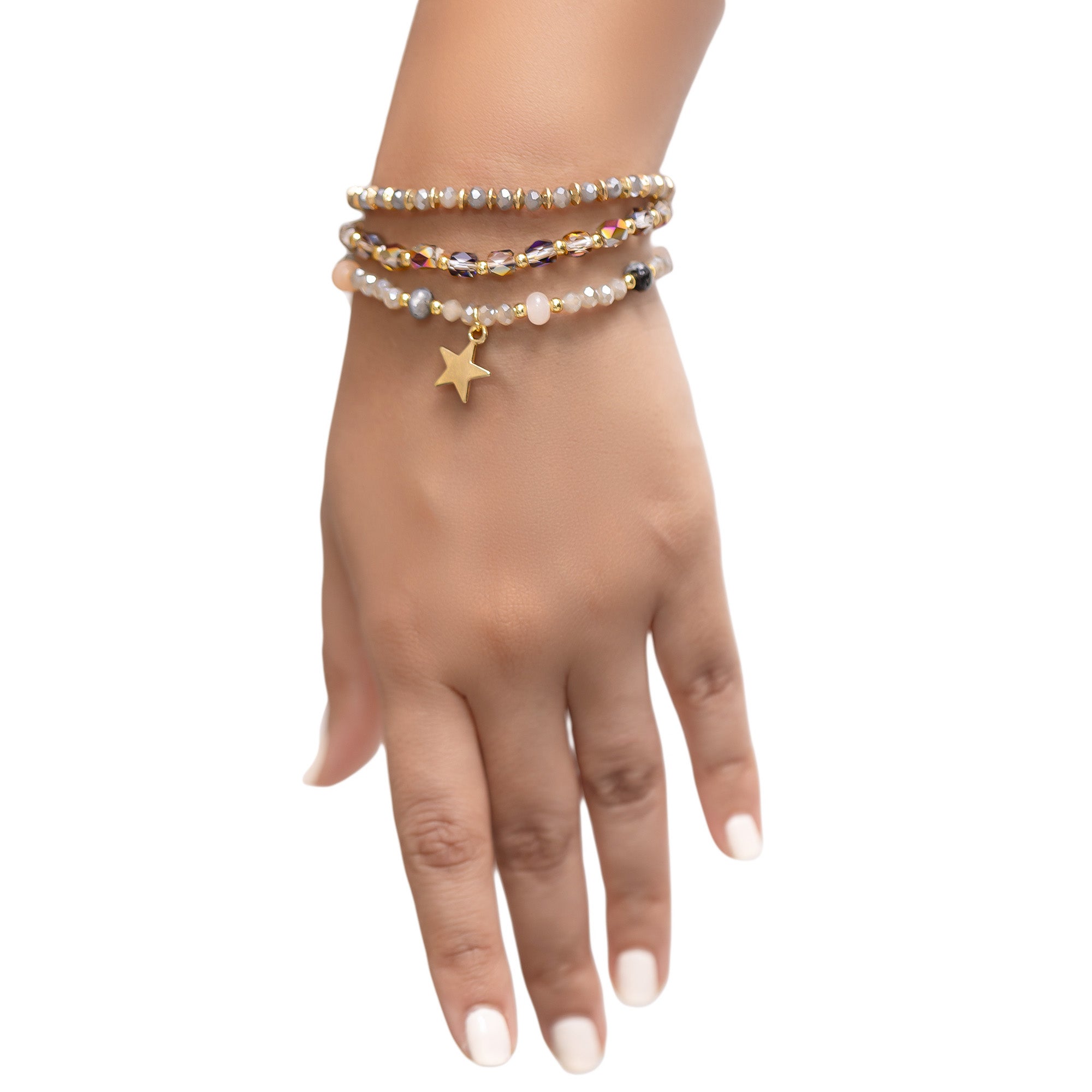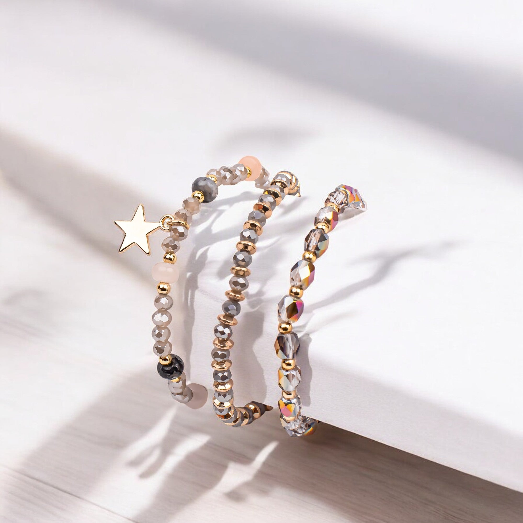 Monochrome Beads With Golden Star Charm 3 Layer Stackable Bracelet
