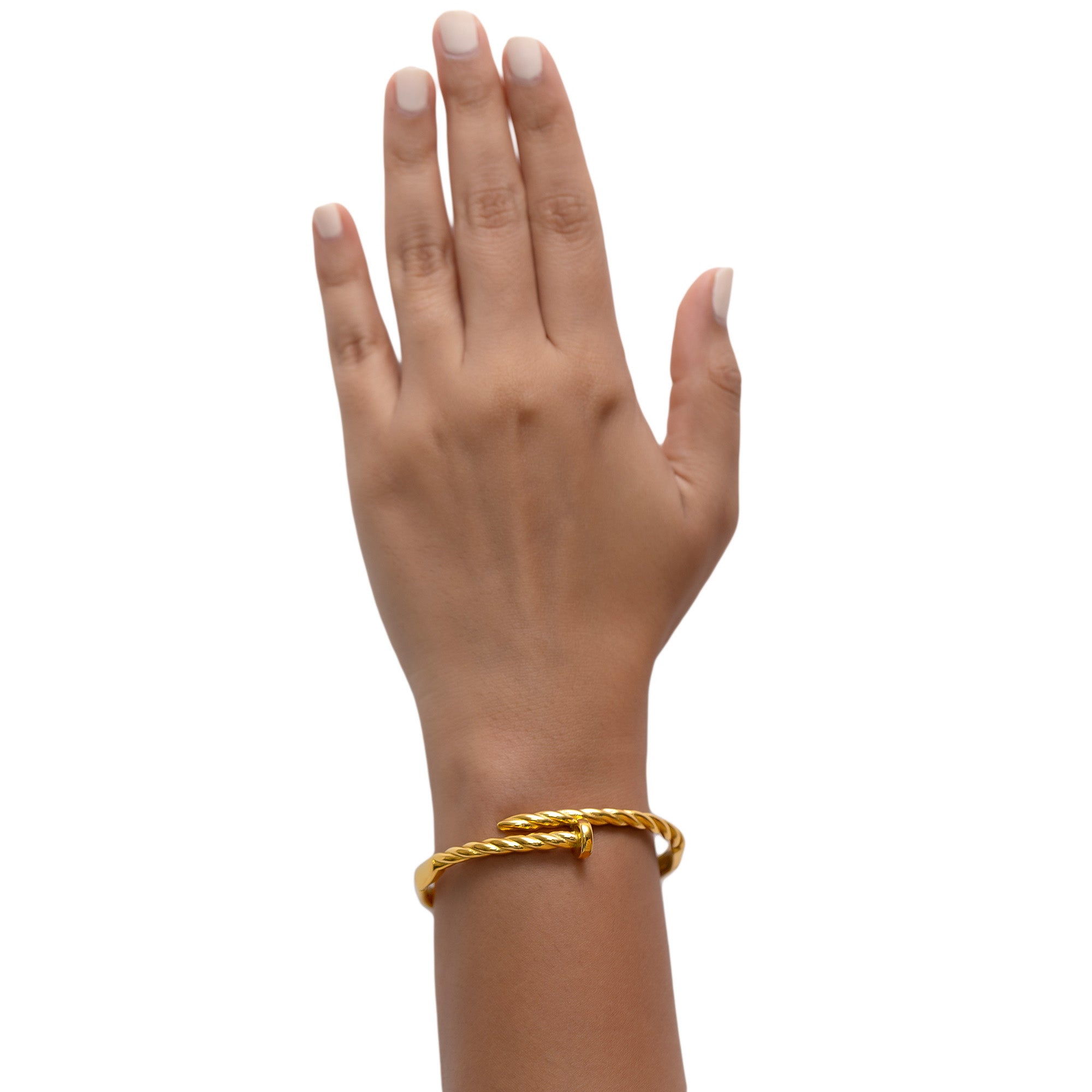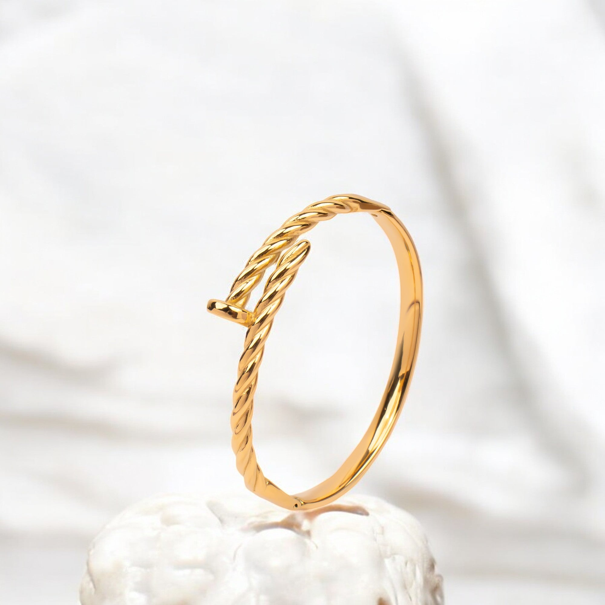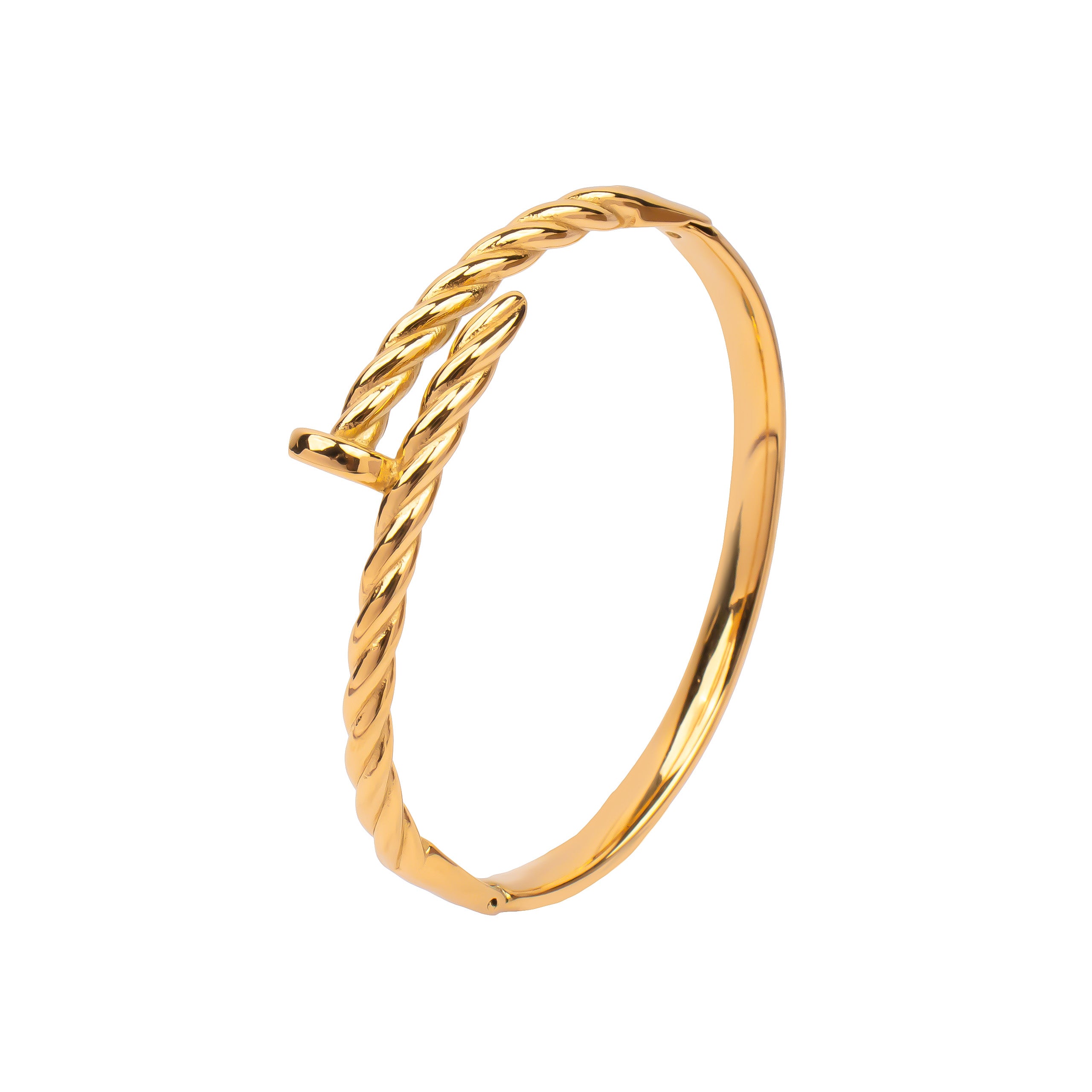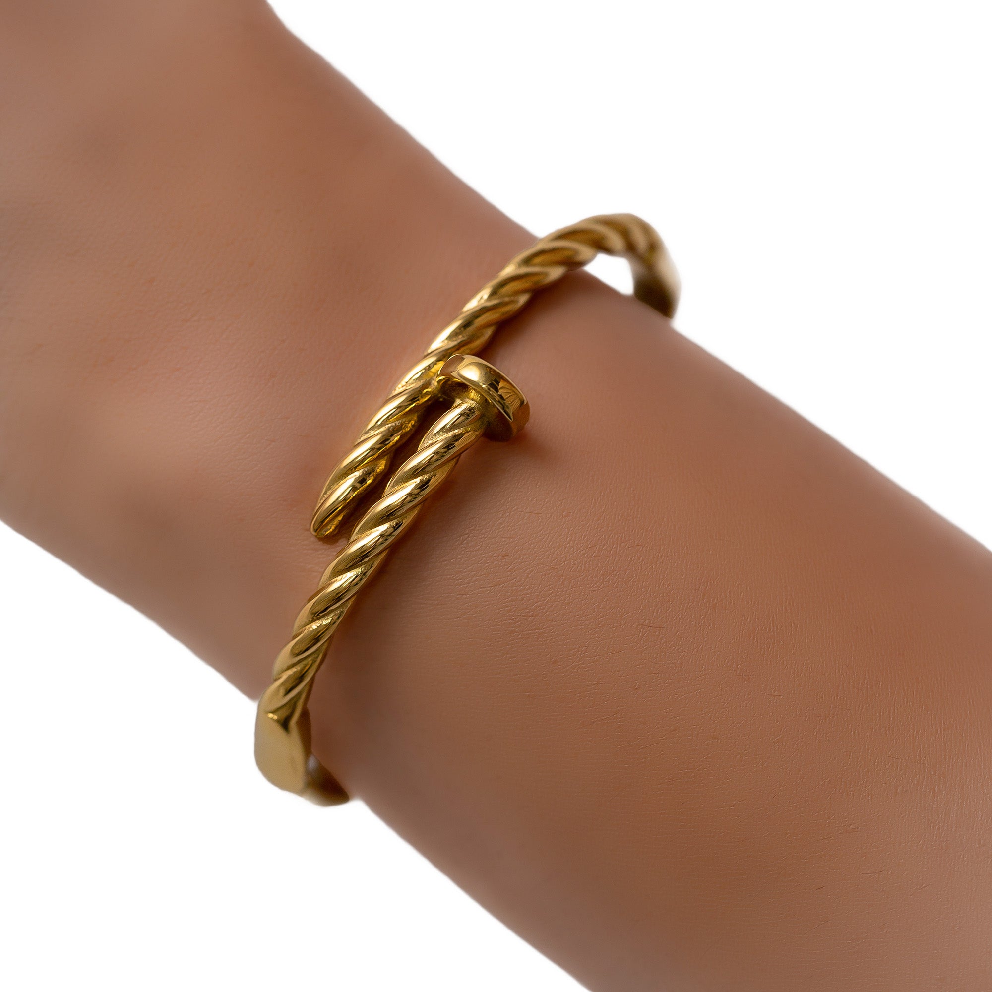 The twist textured nail bracelet showcases a bold, twisted design that resembles a nail, adding a striking flair. Its unique texture and contemporary style make it a standout accessory for any fashion-forward look.