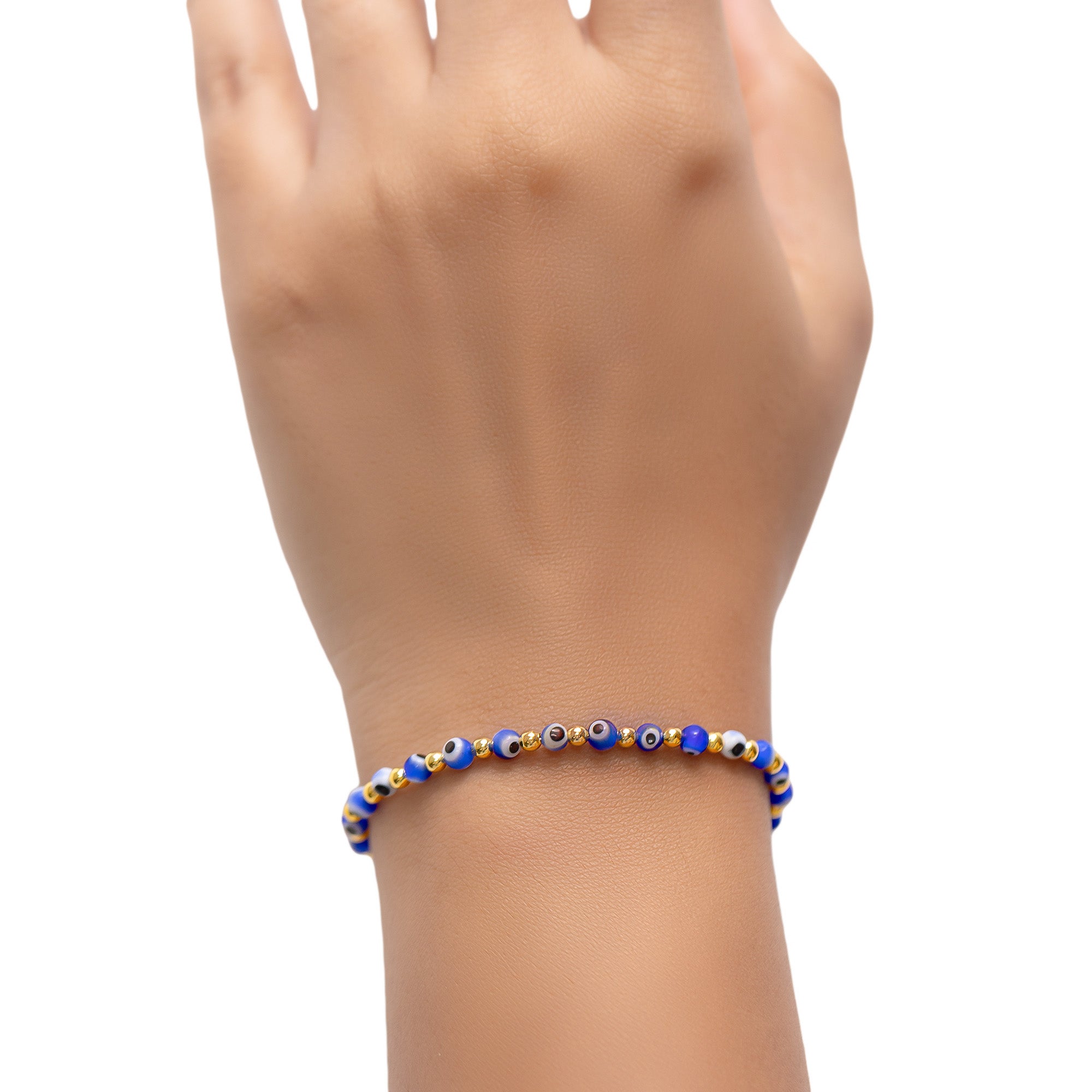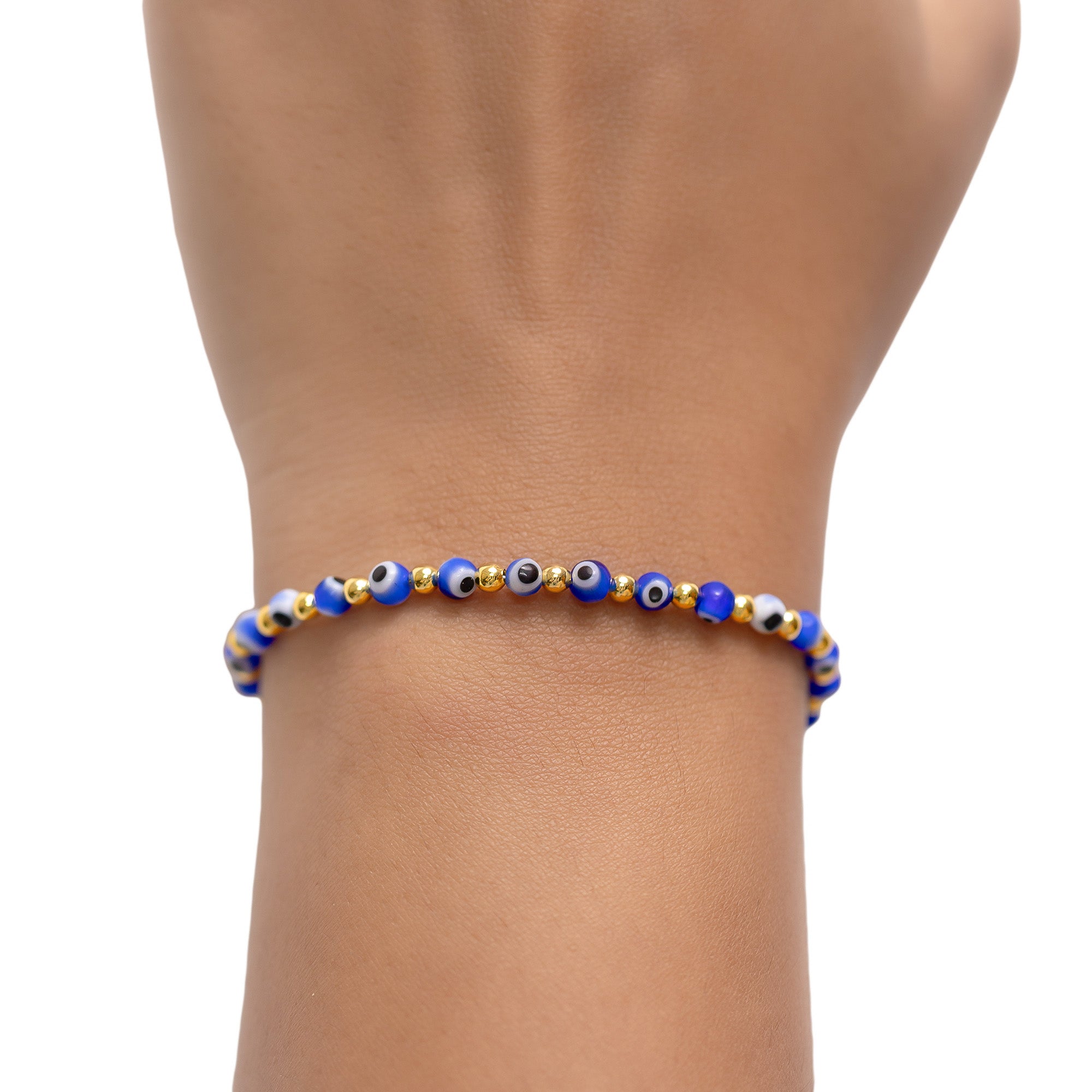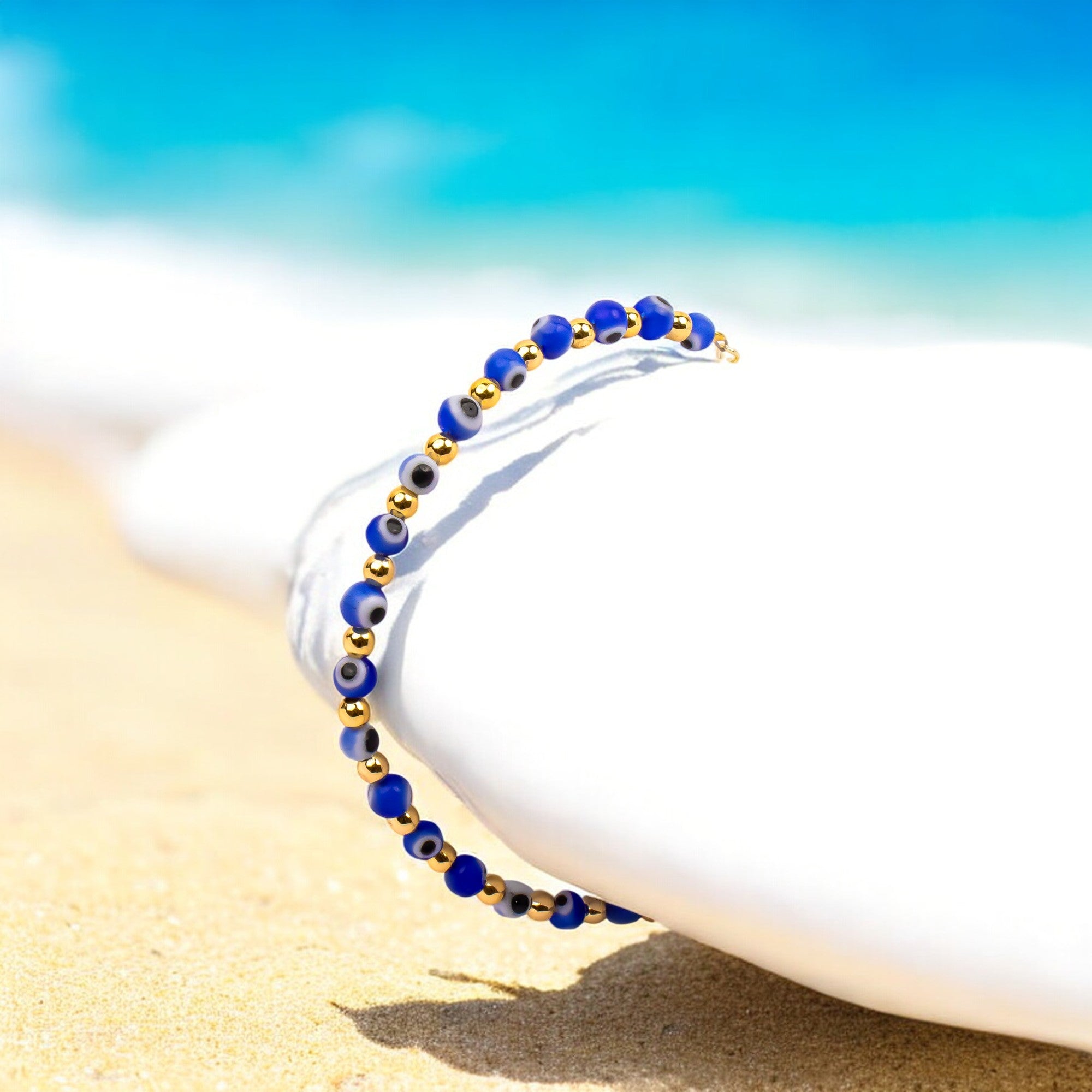 Protect your style with this delicate evil eye bracelet, featuring a petite, gleaming charm that wards off negative energy and adds a touch of mystical chic to any outfit.