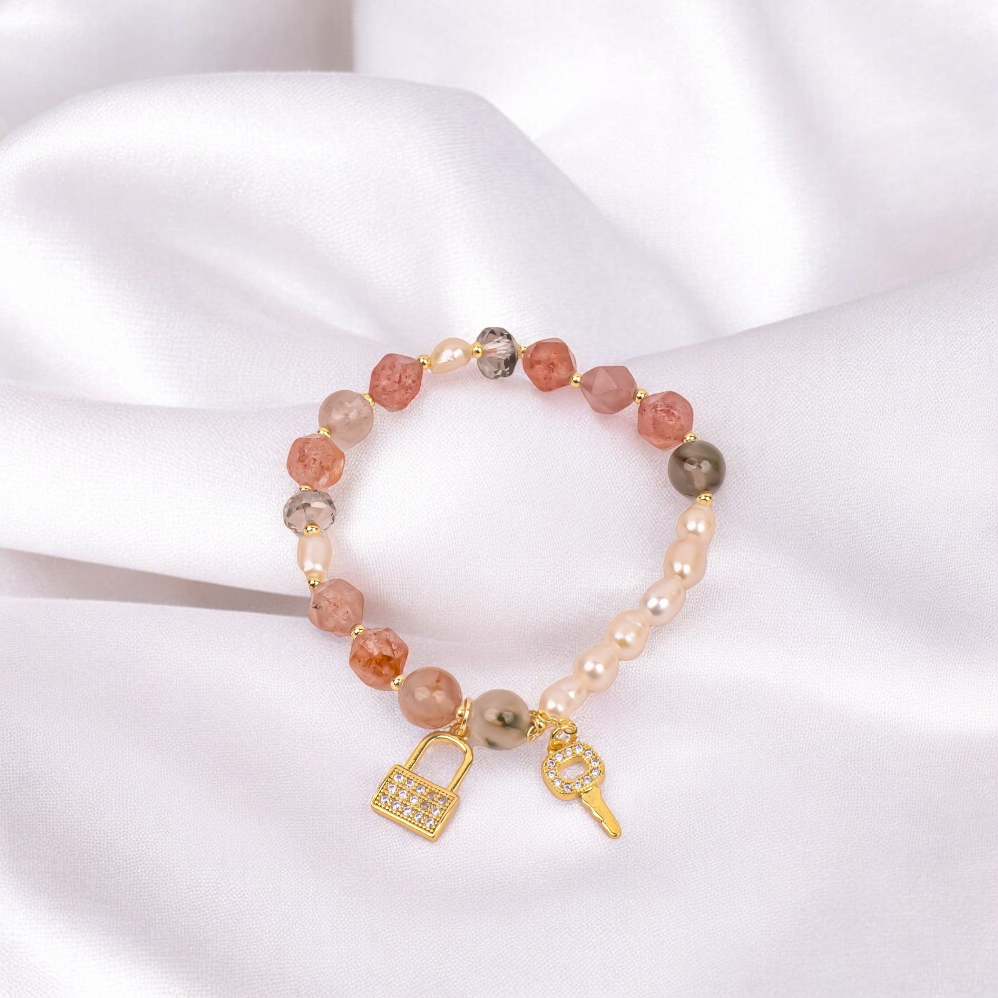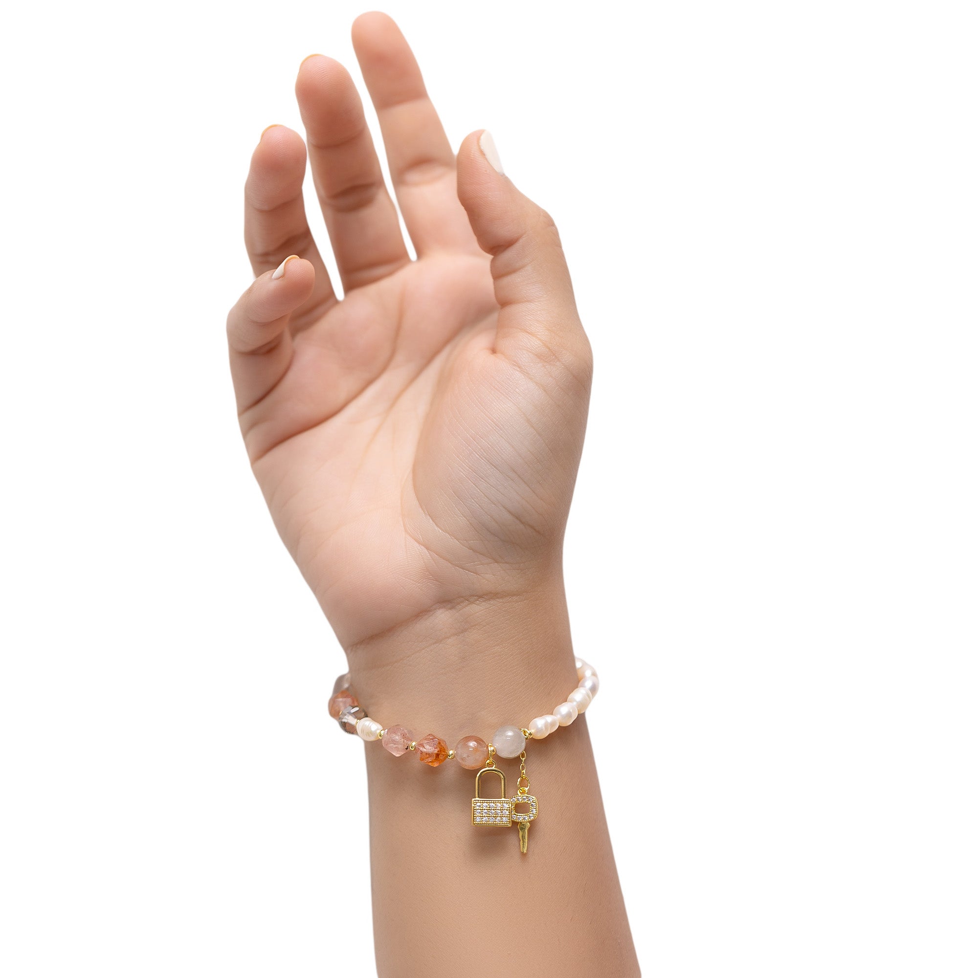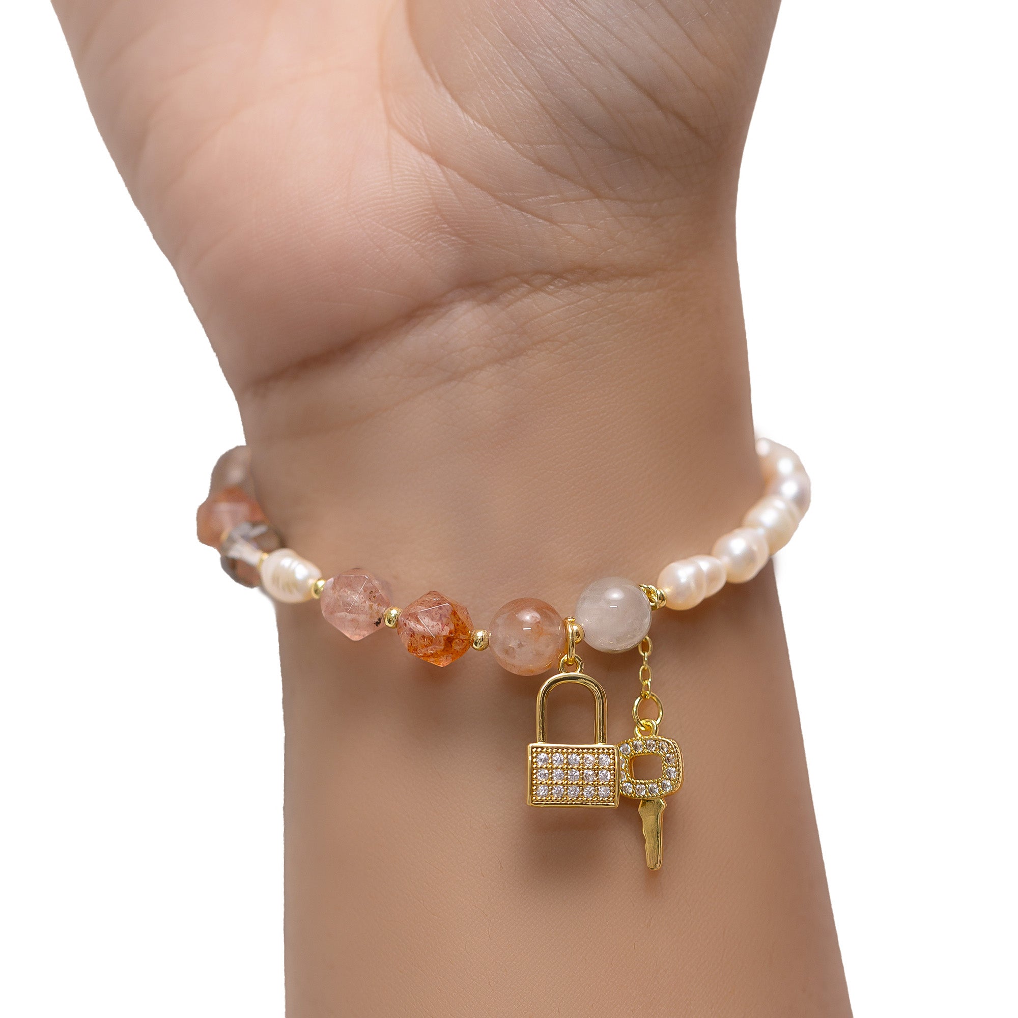 Premium Pearl & Earthy Crystal Bracelet With Lock & Key Charm