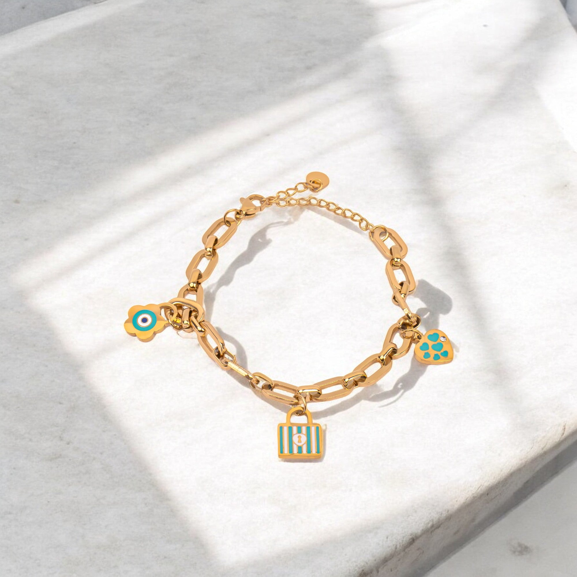 The turquoise-colored multi-charms bracelet showcases a vibrant array of charms that add a playful and colorful touch. Its eye-catching design and lively hues make it a perfect accessory for brightening up any outfit.