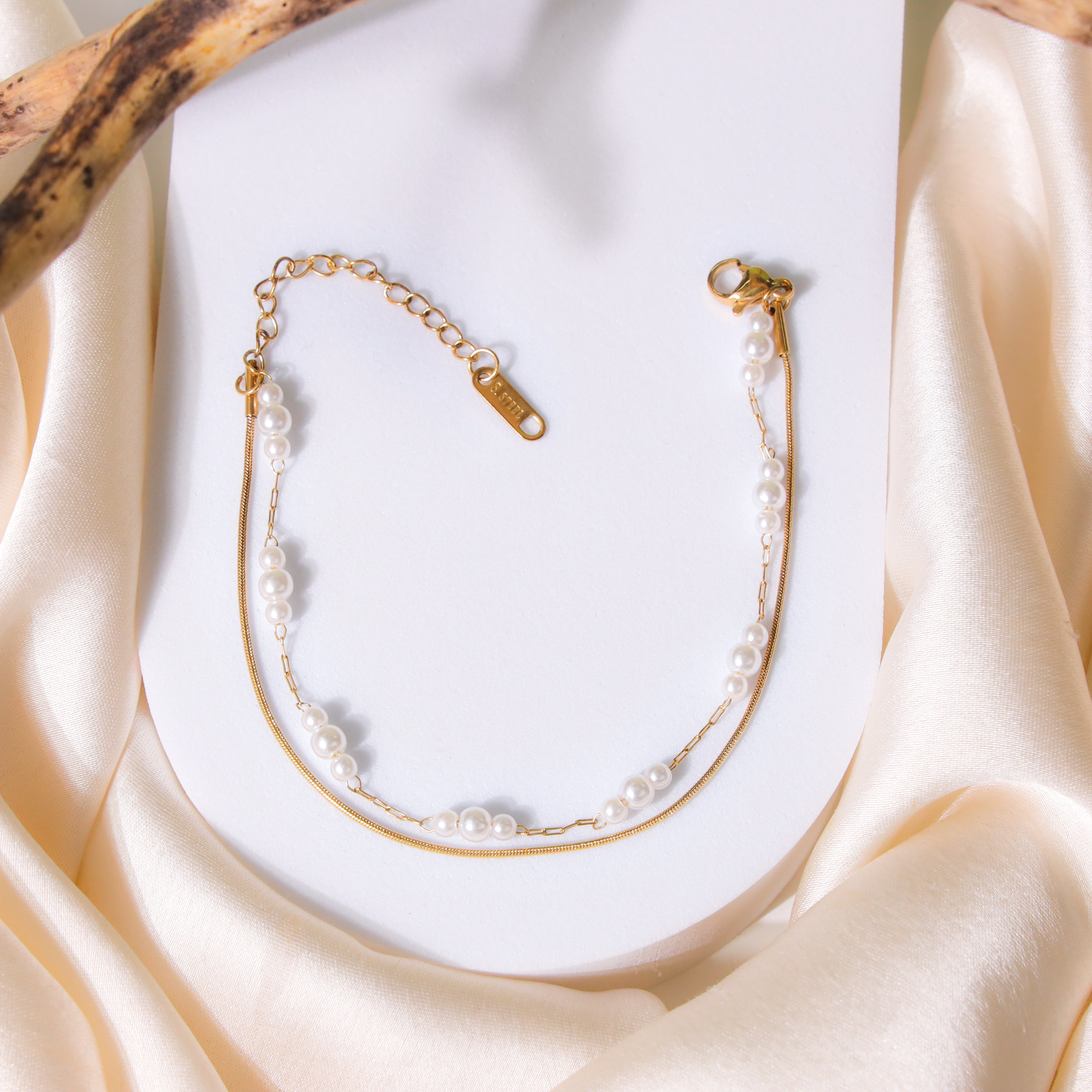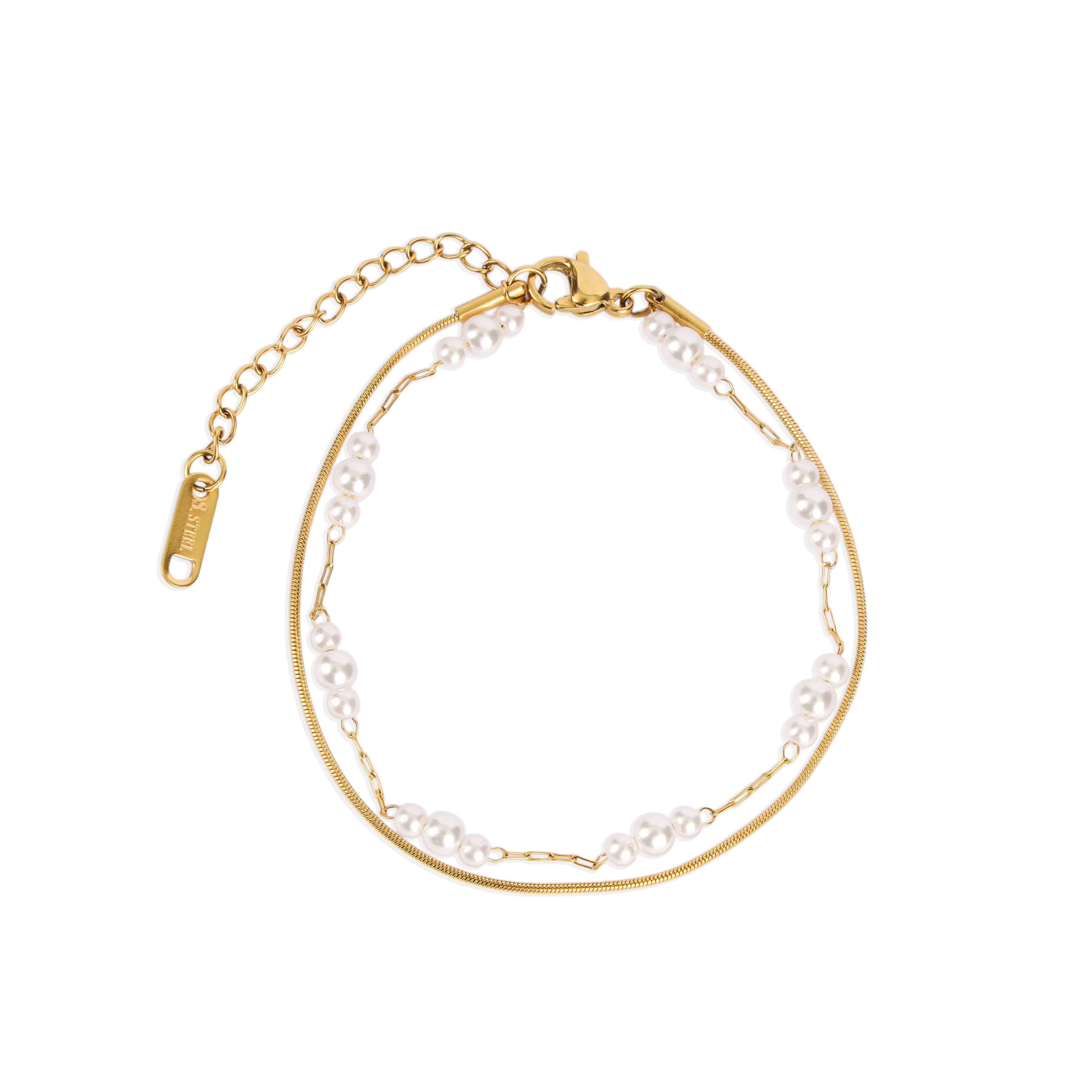 The Two Layer Pearly Bracelet features elegant and lustrous pearls, creating a sophisticated layered look. Its timeless design adds a touch of class and femininity to any ensemble.